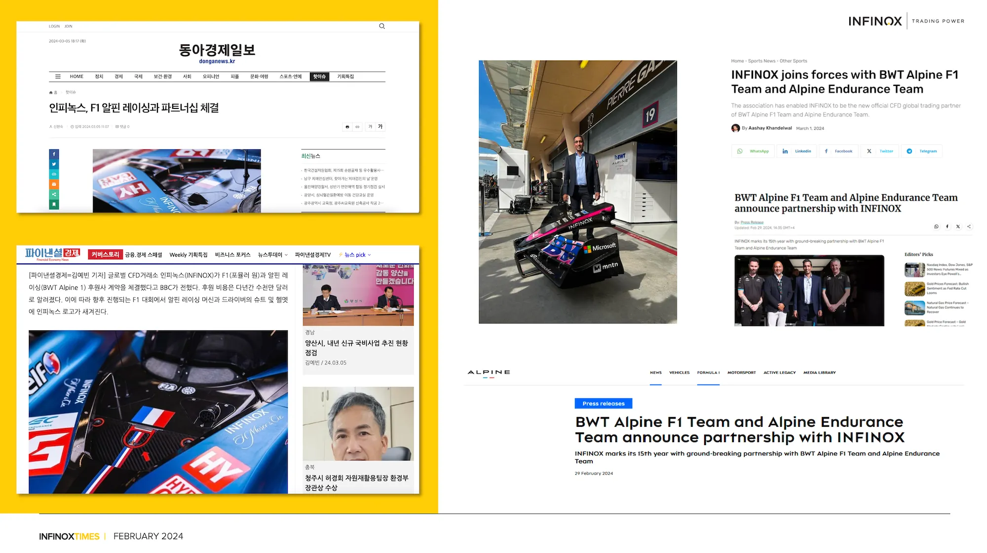 글로벌 CFD거래소 인피녹스(INFINOX)와 F1(포뮬러 원)과 알핀 레이싱(BWT Alpine 1)이 후원사 계약을 체결함에 따라 앞으로 전 세계에서 열리는 포뮬러 원 레이싱 대회에서 전설적인 알핀 F1 팀과 함께 인피녹스를 함께 보실 수 있습니다.
