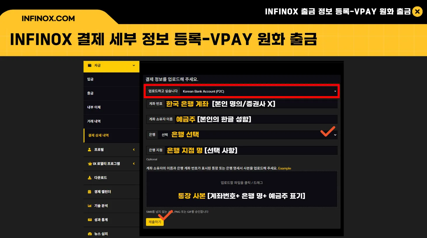 INFINOX 인피녹스 출금 신청 시 결제 상세 내역에 등록된 정보로 접수되며, 원화 출금의 경우 입금 시 사용하신 본인 명의의 은행 계좌로 출금하실 수 있습니다.