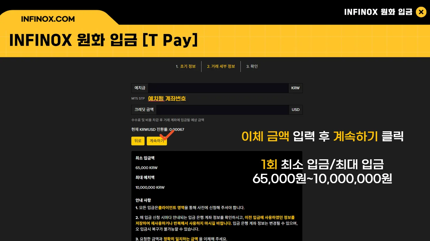 최소 입금액은 65,000원 / 1회 최대 입금액은 10,000,000원 입니다.