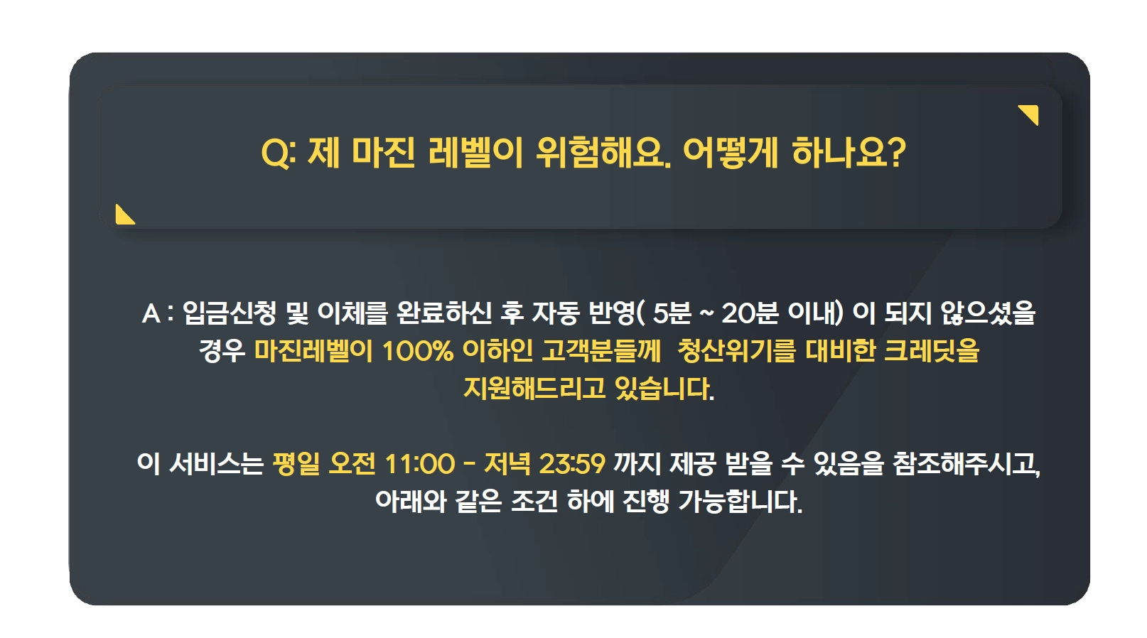 * 해당 시간 외 입금을 진행하실 경우 수동 처리 될 수 있으므로 마진레벨을 넉넉히 고려하시어 사전 입금 진행 해주시고, 고객센터 상담 시간 이내에 문의 주시길 바랍니다.