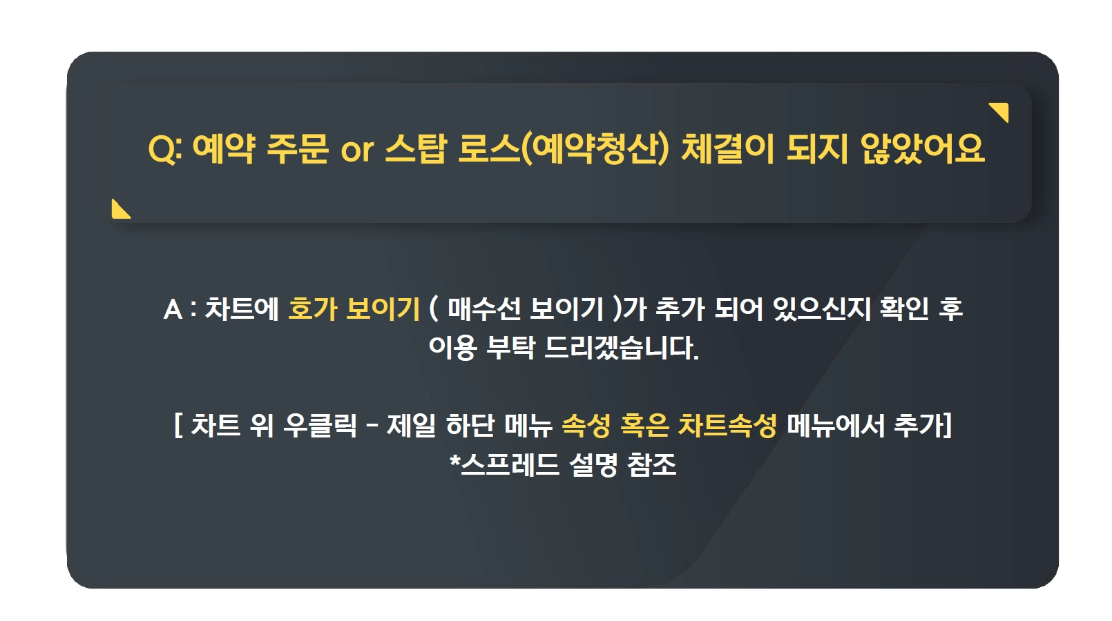 Q : 예약 주문 or 스탑 로스(예약청산) 체결이 되지 않았어요.
