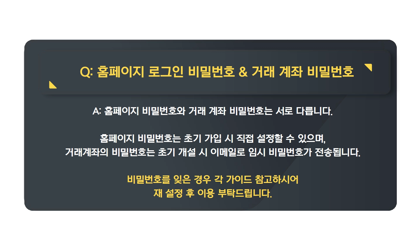 Q : 홈페이지 비밀번호와 거래 계좌 비밀번호는 같나요?