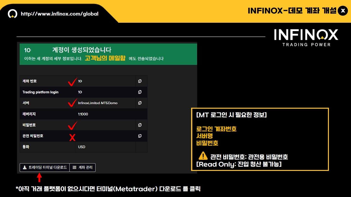 로그인 정보를 확인하여 MetaTrader에 로그인 할 수 있습니다. 비밀번호는 반드시 띄어쓰기를 제외하고 복사해 주세요.