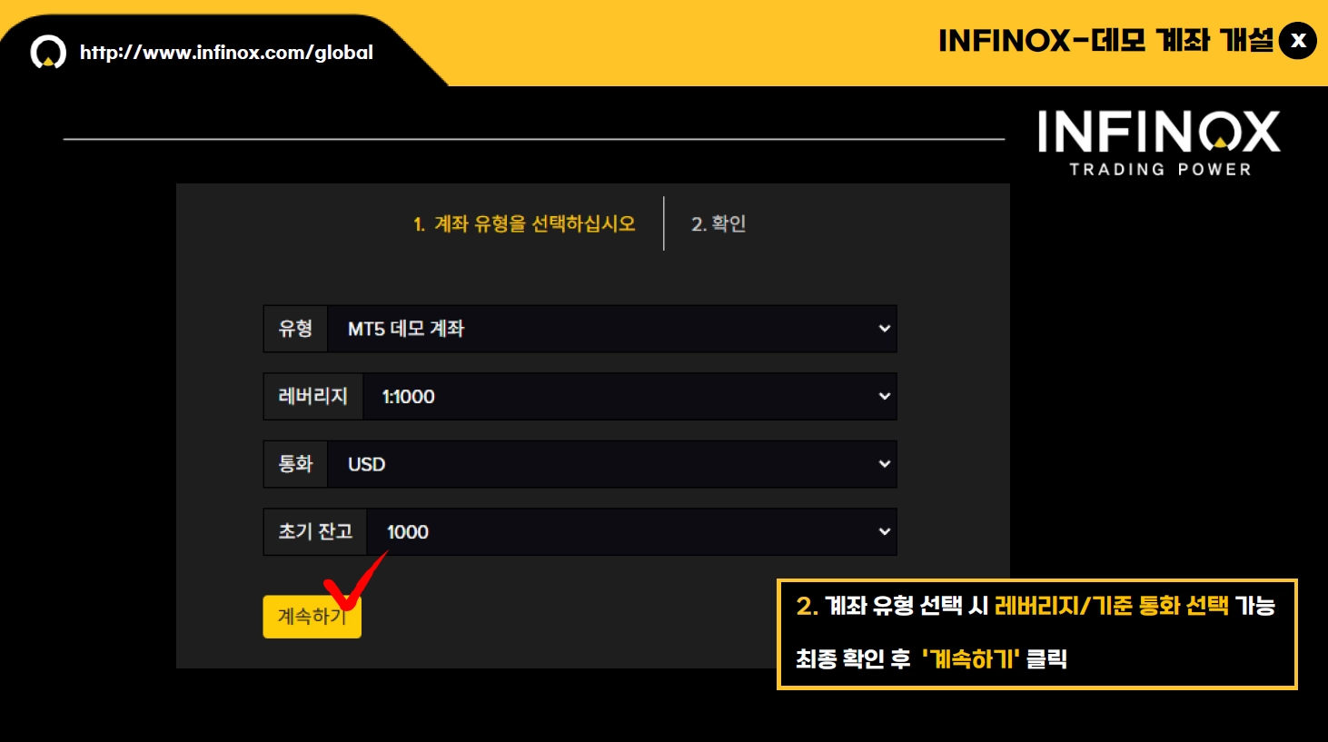 계좌 유형 및 래버리지를 선택 후 계속하기를 누르시면 생성될 계좌의 정보를 확인할 수 있습니다