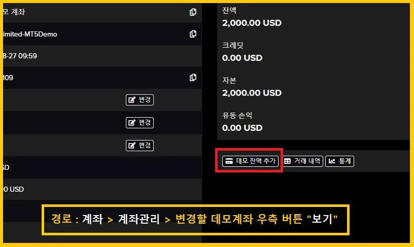 데모 계좌 잔액 재설정 변경 방법 계좌 > 계좌 관리 > 변경할 데모 계좌 우측 버튼 “보기” > 데모 잔액 추가