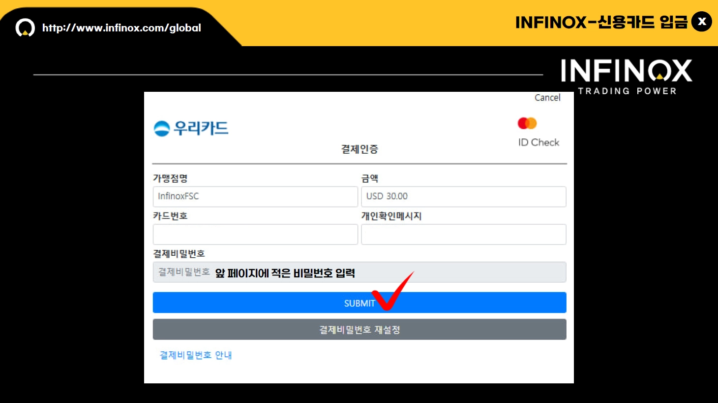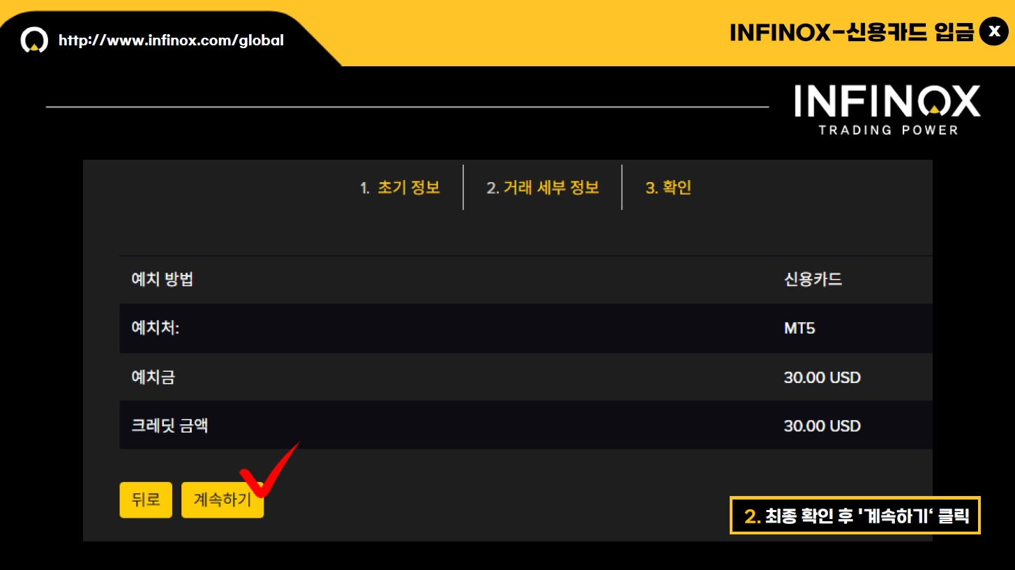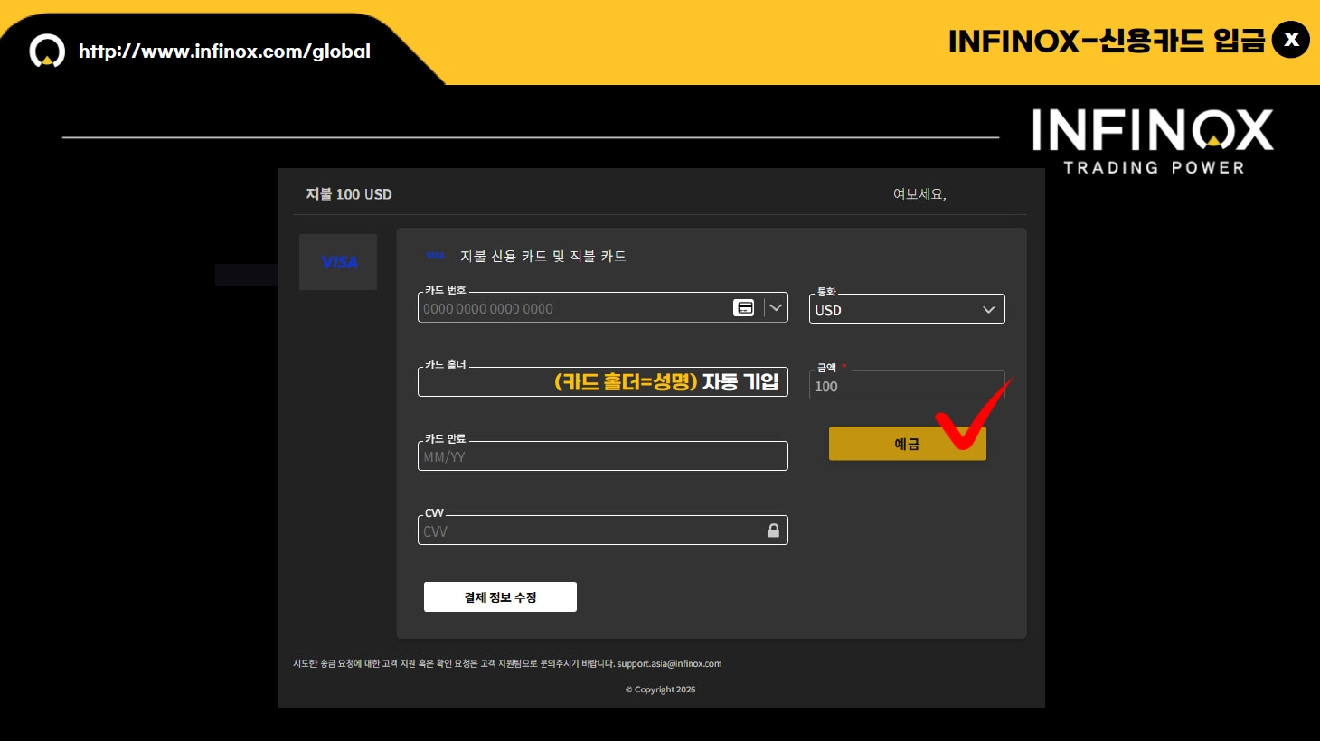 카드번호 / 카드 홀더( 카드 소유주) / 카드 기간 / CVC 혹은 CVV 등을 입력 , 확인해 주시고, 예금 버튼을 눌러주세요 .