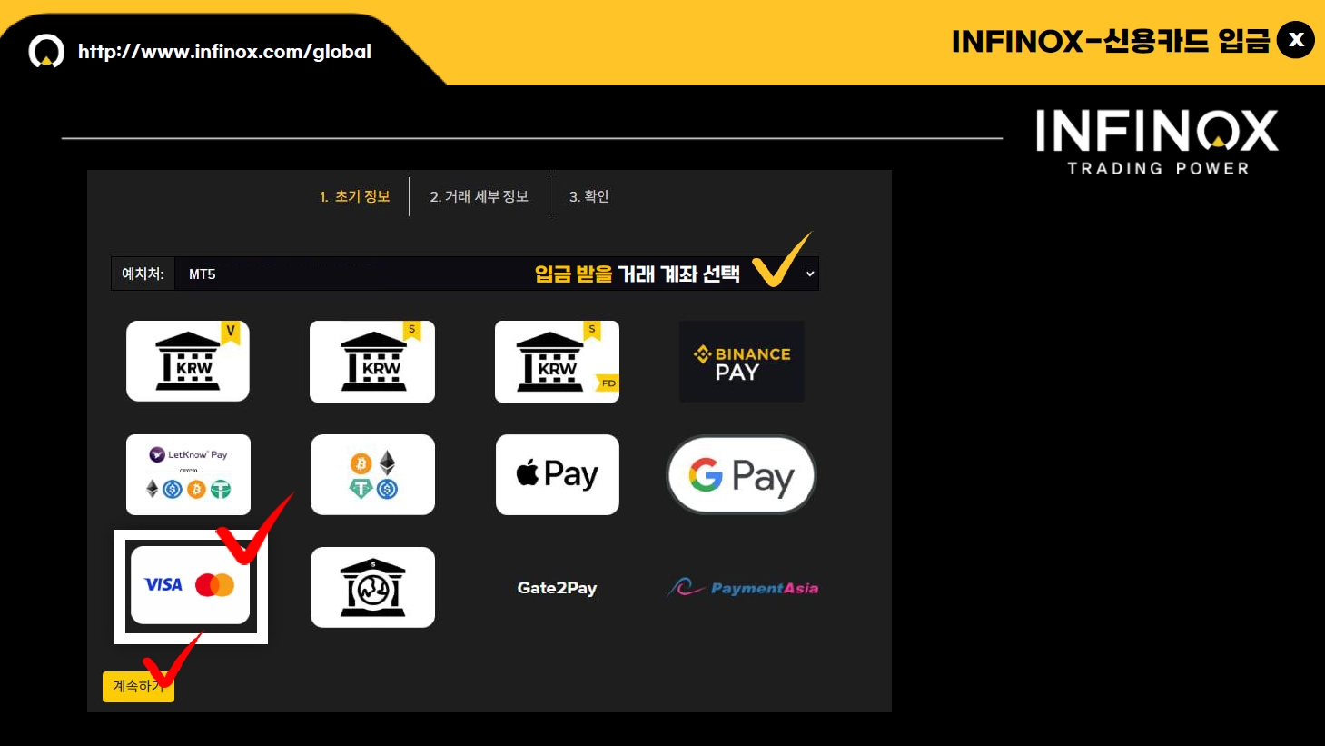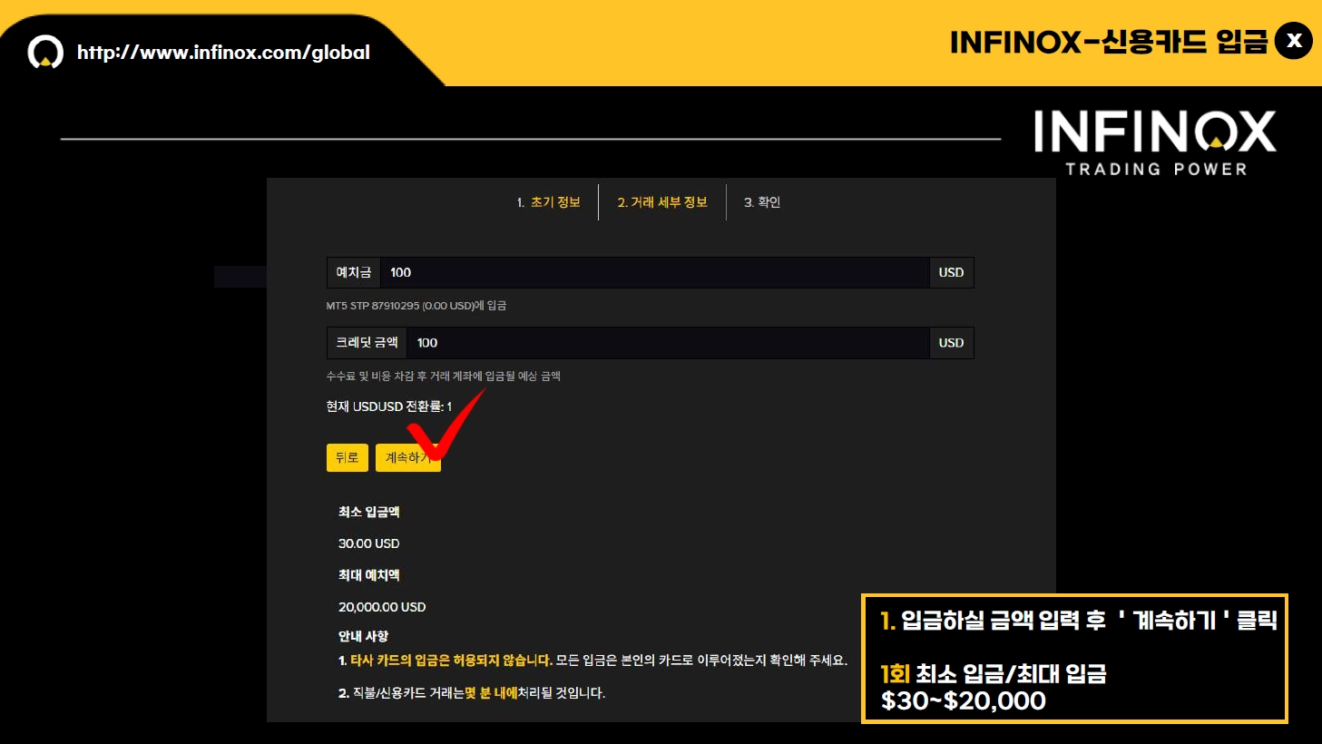 예치금 란에 입금하실 달러 금액을 입력해 주시고 계속하기를 눌러주세요.