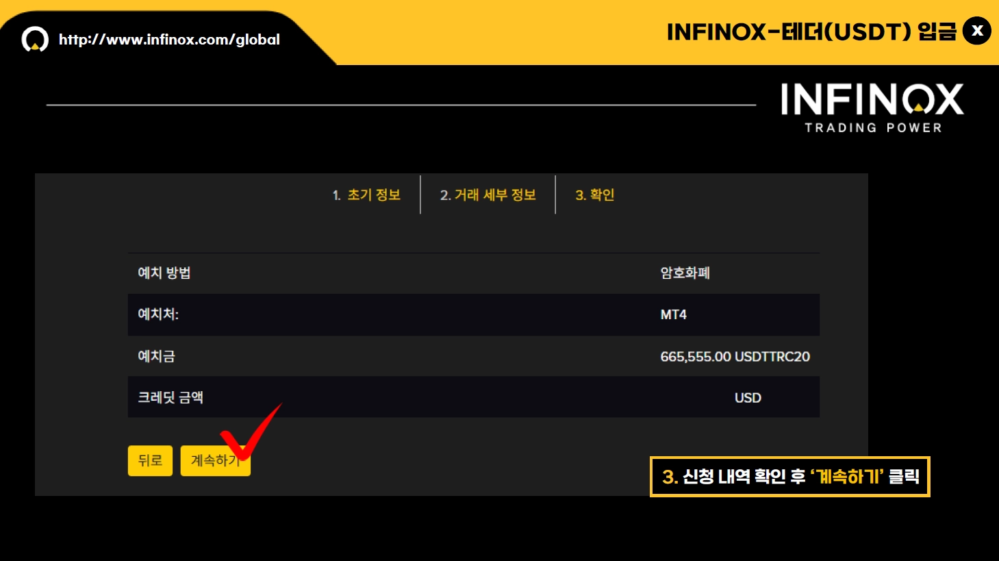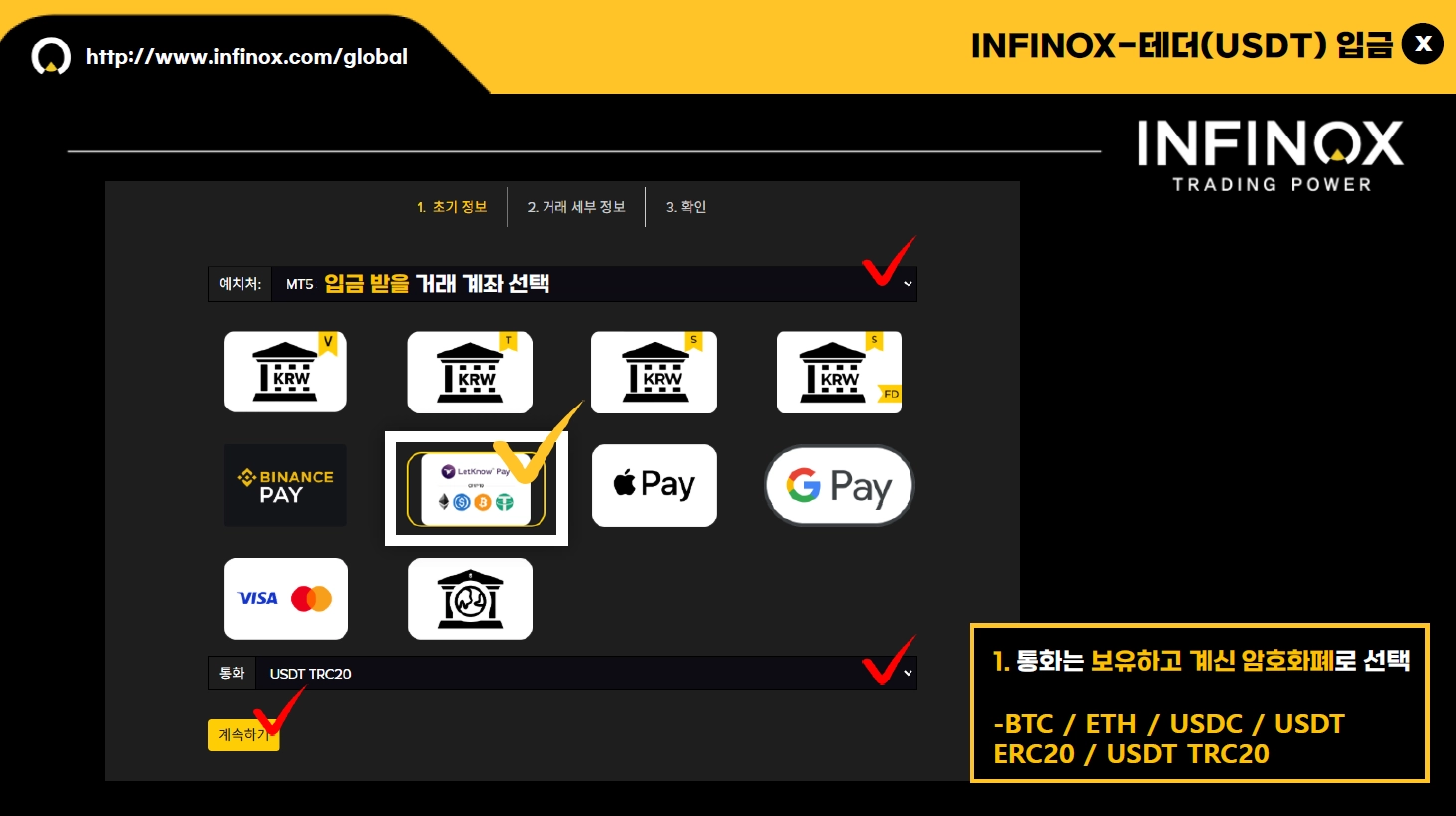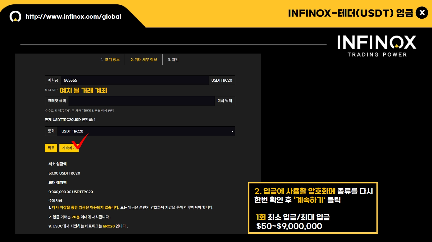 입금에 사용할 암호화폐 종류를 다시 한번 확인해 주시고 “계속하기” 를 클릭해 주세요.