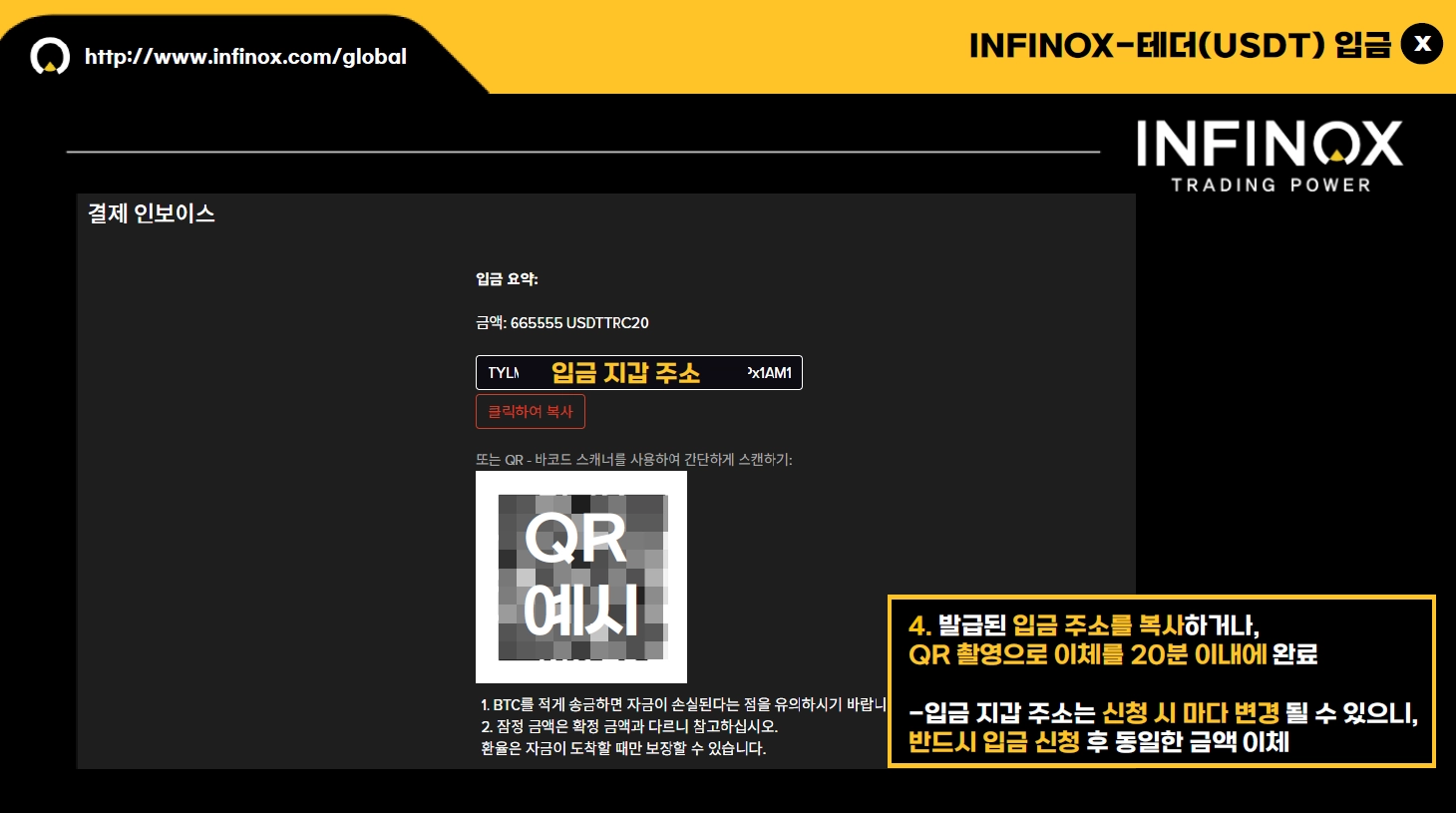 발급된 입금 지갑 주소를 복사하거나, QR 촬영으로 이체를 20분 이내 완료해 주세요.