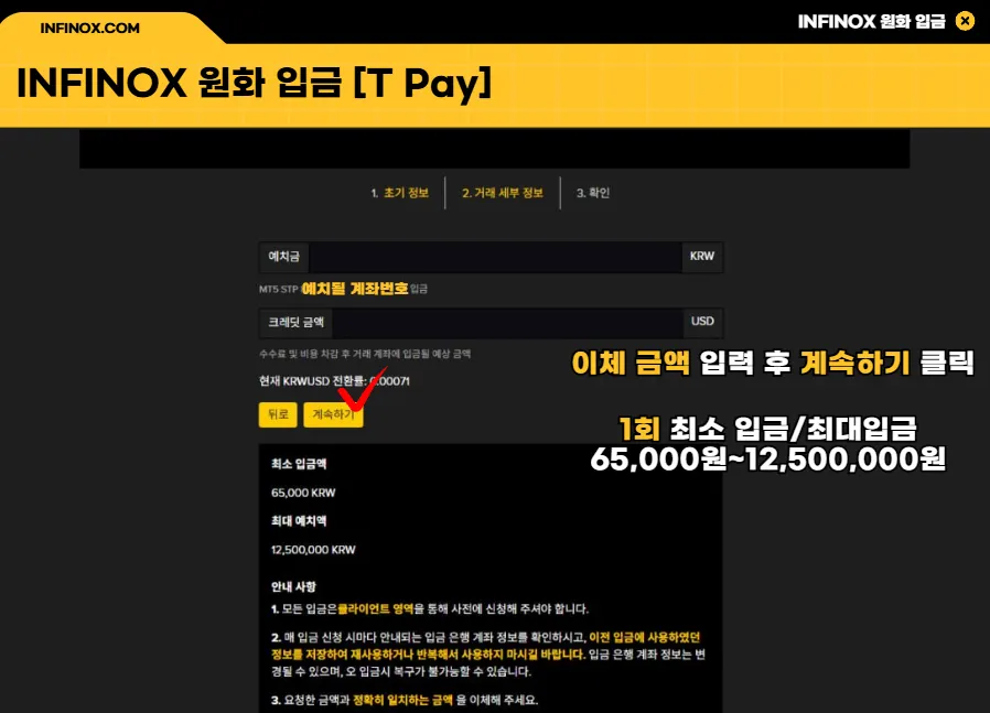 최소 입금액은 65,000원 / 1회 최대 입금액은 12,500,000원 입니다.