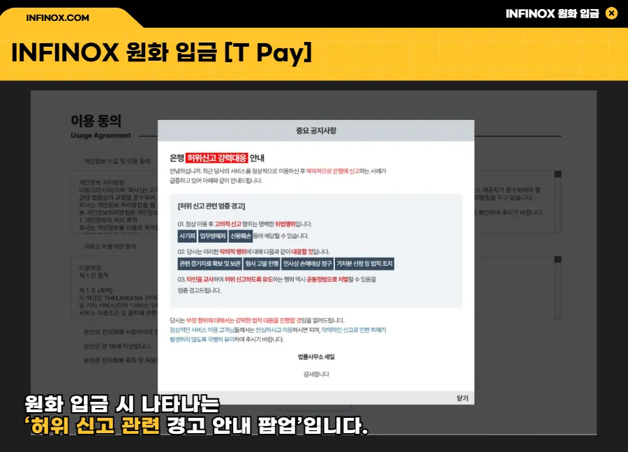 입금 절차 중에는 아래와 같은 ‘허위 신고 및 강력 대응 안내’ 팝업이 나타납니다. 이는 정상적으로 서비스를 이용한 뒤 악의적으로 은행에 신고하는 경우 발생할 수 있는 법적 조치와 불이익을 사전에 안내하는 고지문이며 정상 이용 고객은 단순히 내용을 확인 후 [닫기] 버튼을 누르고 다음 단계로 진행하시면 됩니다