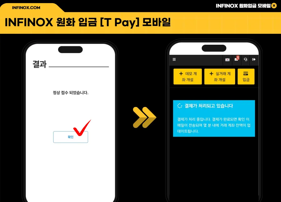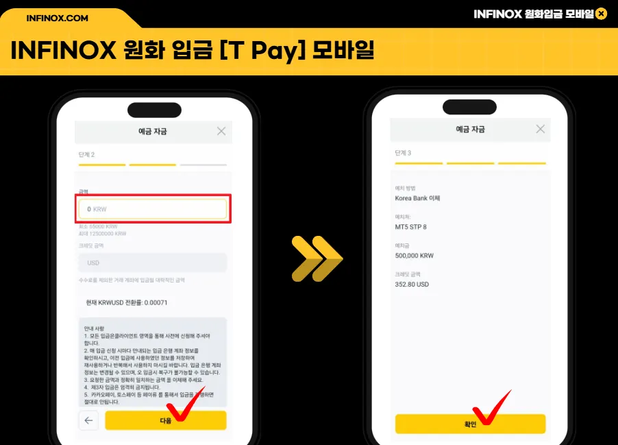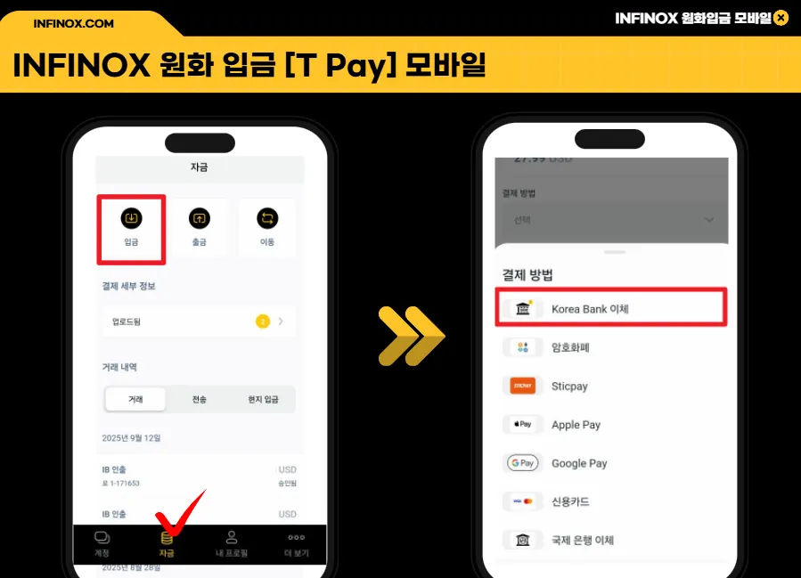 인피녹스 어플에서 자금 > 입금을 선택한 뒤, 입금하실 계좌 번호와 [T] Korea Bank 이체를 선택해 주세요.