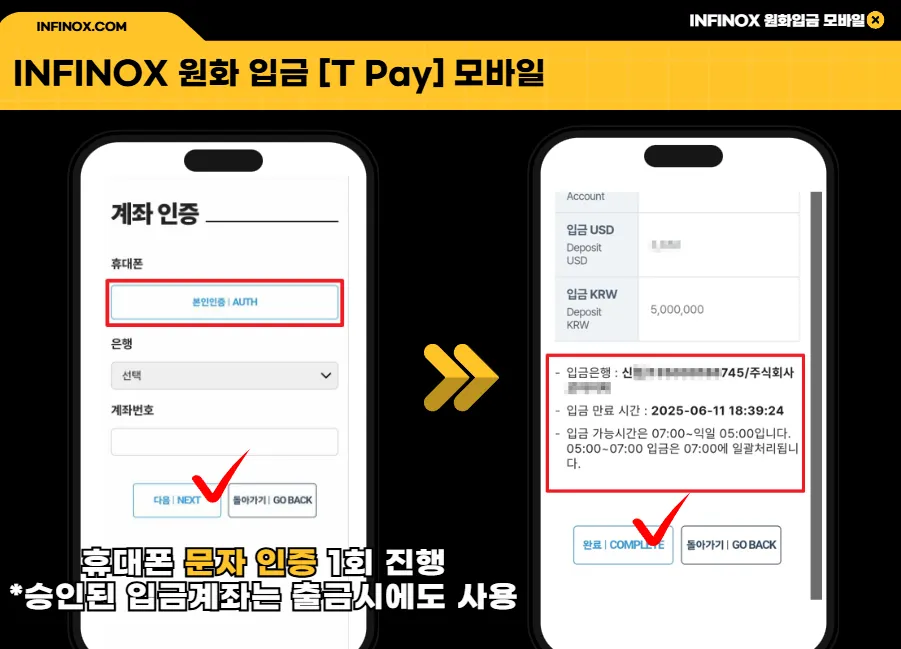 인증된 은행계좌에서 입금하지 않을경우 이용에 제한 또는 반환처리 될 수 있습니다.
