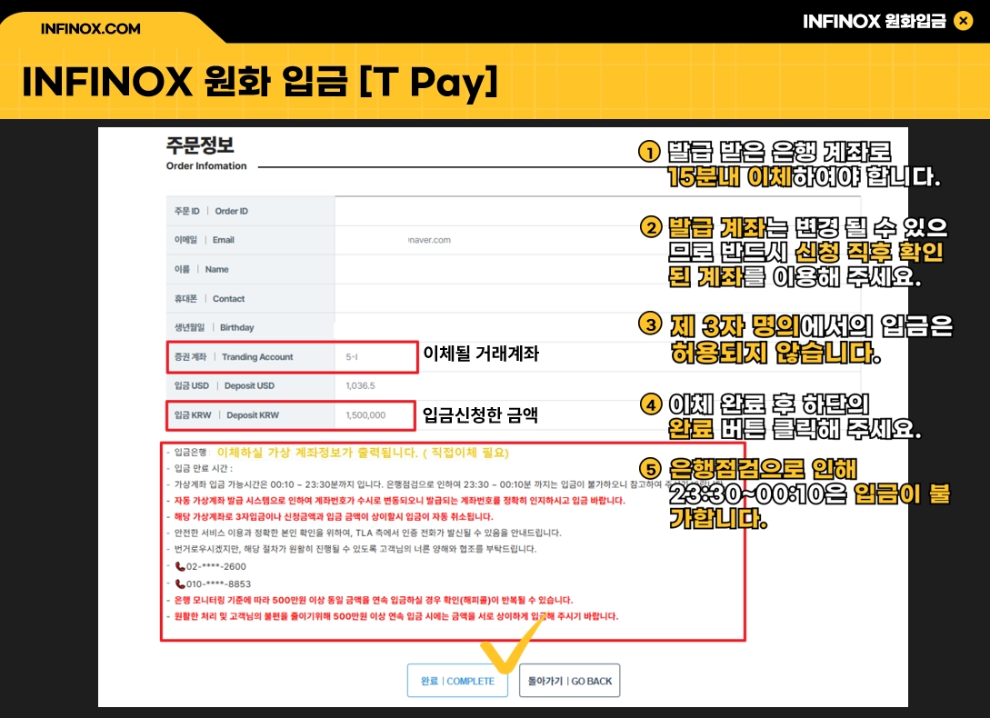 입금 자동 반영은 5분 - 30분 이내이며 , 입금 확인 혹은 도움이 필요할 경우 아래 고객 지원 상담 가이드를 확인하시어 문의주시길 바랍니다. 고객 지원 상담 방법 https://infinox.oopy.io/support