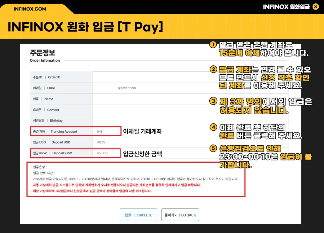 인증된 은행계좌에서 입금하지 않을 경우 이용 제한 또는 반환 처리될 수 있습니다