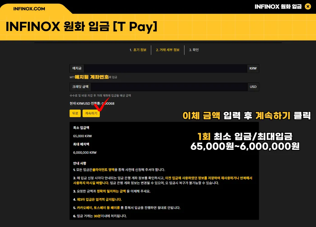 최소 입금액은 65,000원 / 1회 최대 입금액은 6,000,000원 입니다.