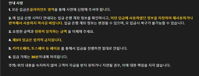 위 권고 사항을 준수하지 않아 발생한 입금 지연 또는 손실에 대해 당사는 책임지지 않습니다.