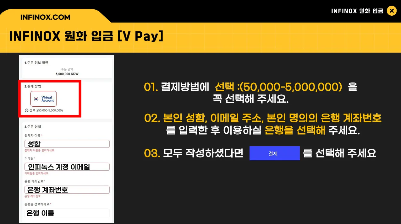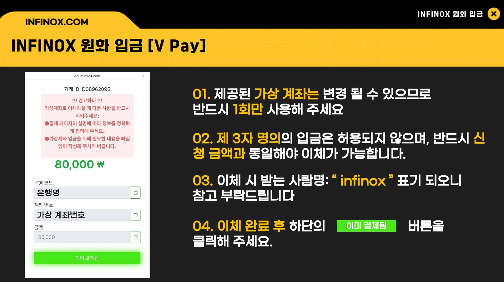 받는 사람명은 ‘INFINOX’로 표시되며, 이체 완료 후 ‘이미 결제됨’ 버튼을 클릭해 주세요.