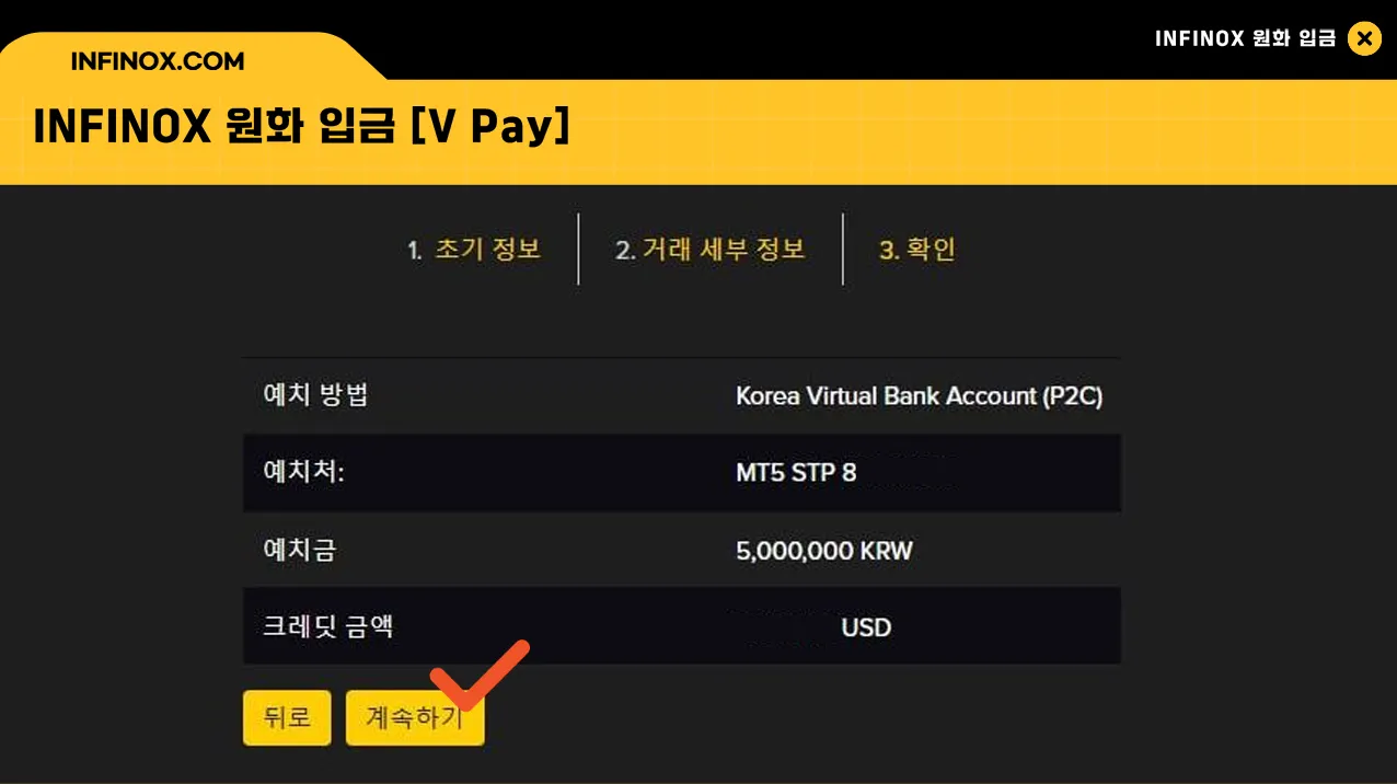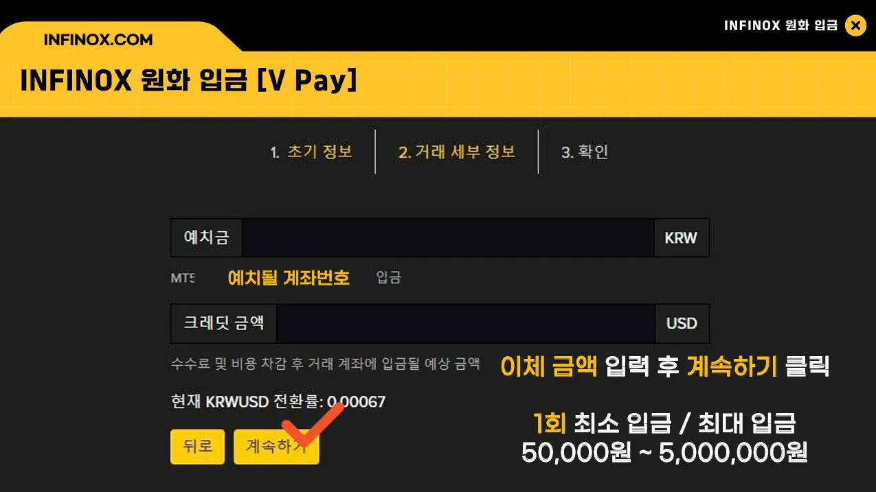홈페이지의 “입금” 메뉴에서 입금하실 계좌 번호와 [V] KRW 를 선택후 계속하기를 눌러주세요.