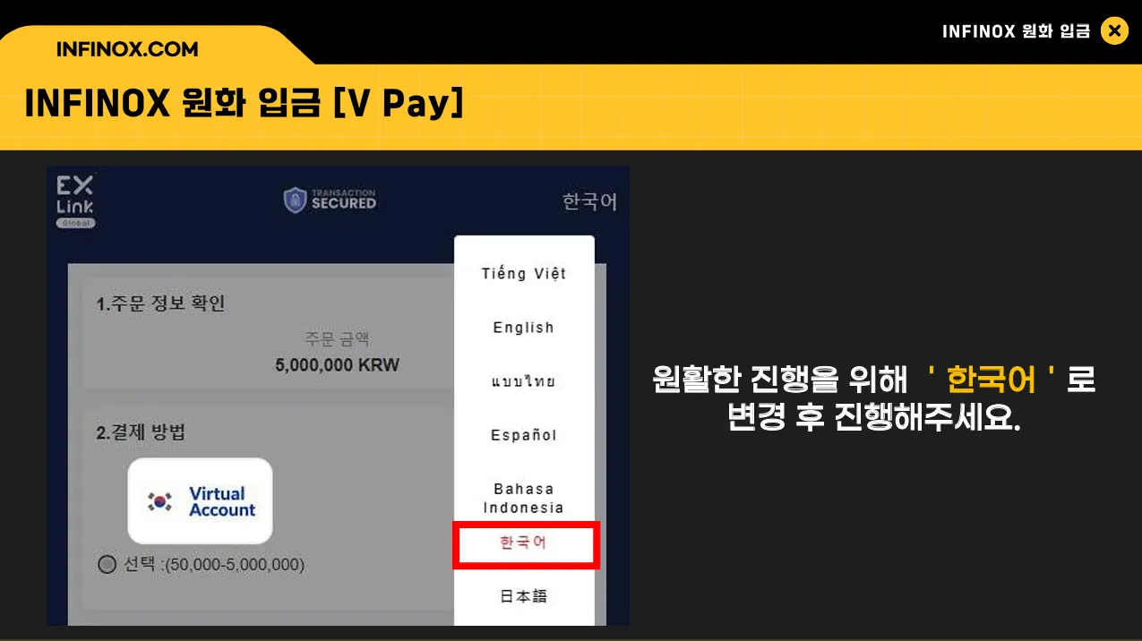 원활한 원화 입금을 위해, 입금 진행 전 우측 상단의 언어 설정을 ‘한국어’로 변경해 주세요