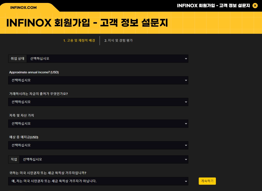 투자 경력 기간과 거래목적을 선택 후 계속하기를 클릭해주세요
