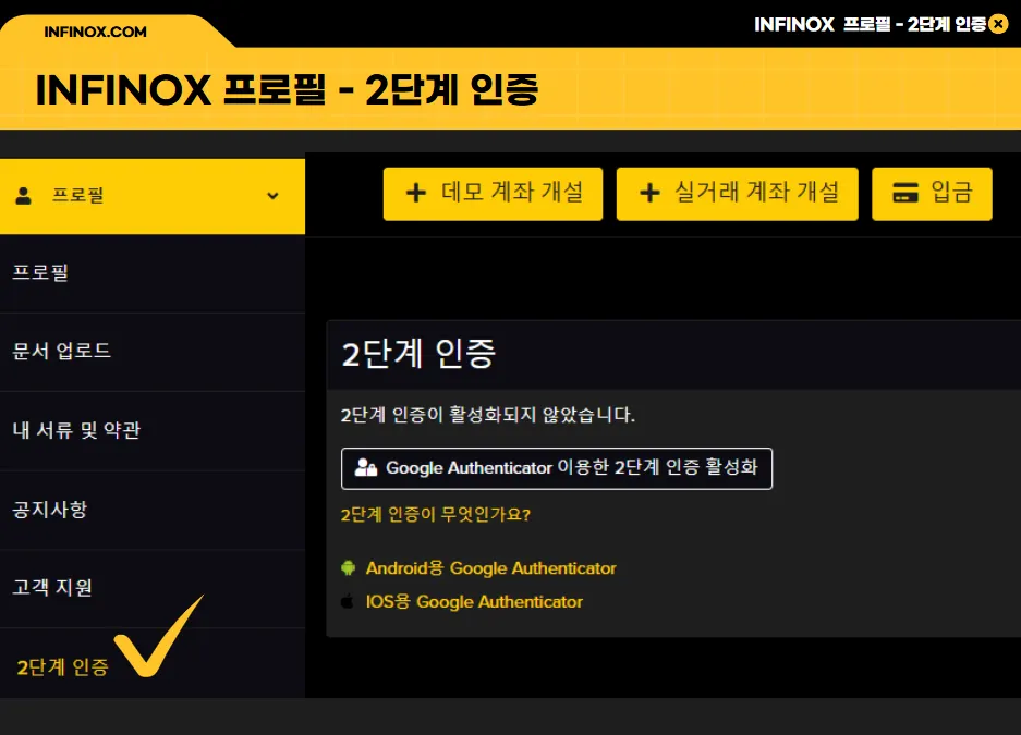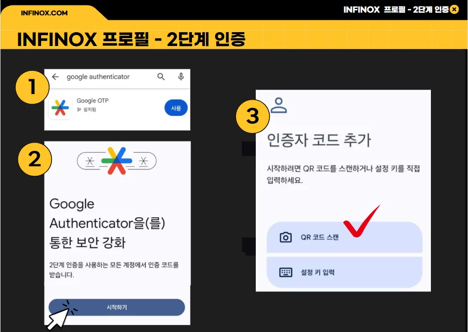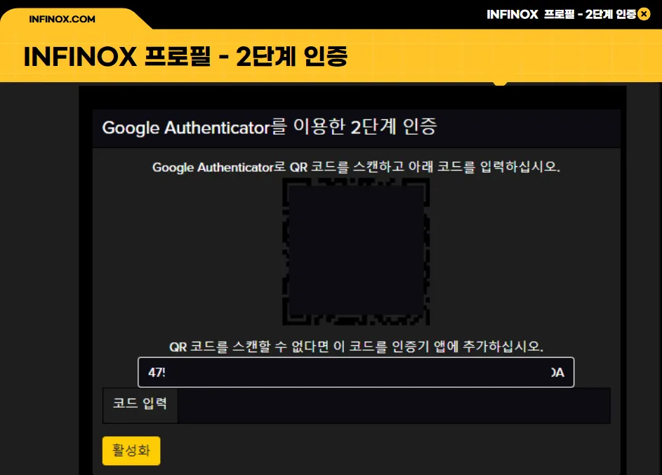 INFINOX 인피녹스 홈페이지 로그인시 모바일 “Google Authenticator” 어플을 통하여 2단계 인증을 추가할 수 있습니다.