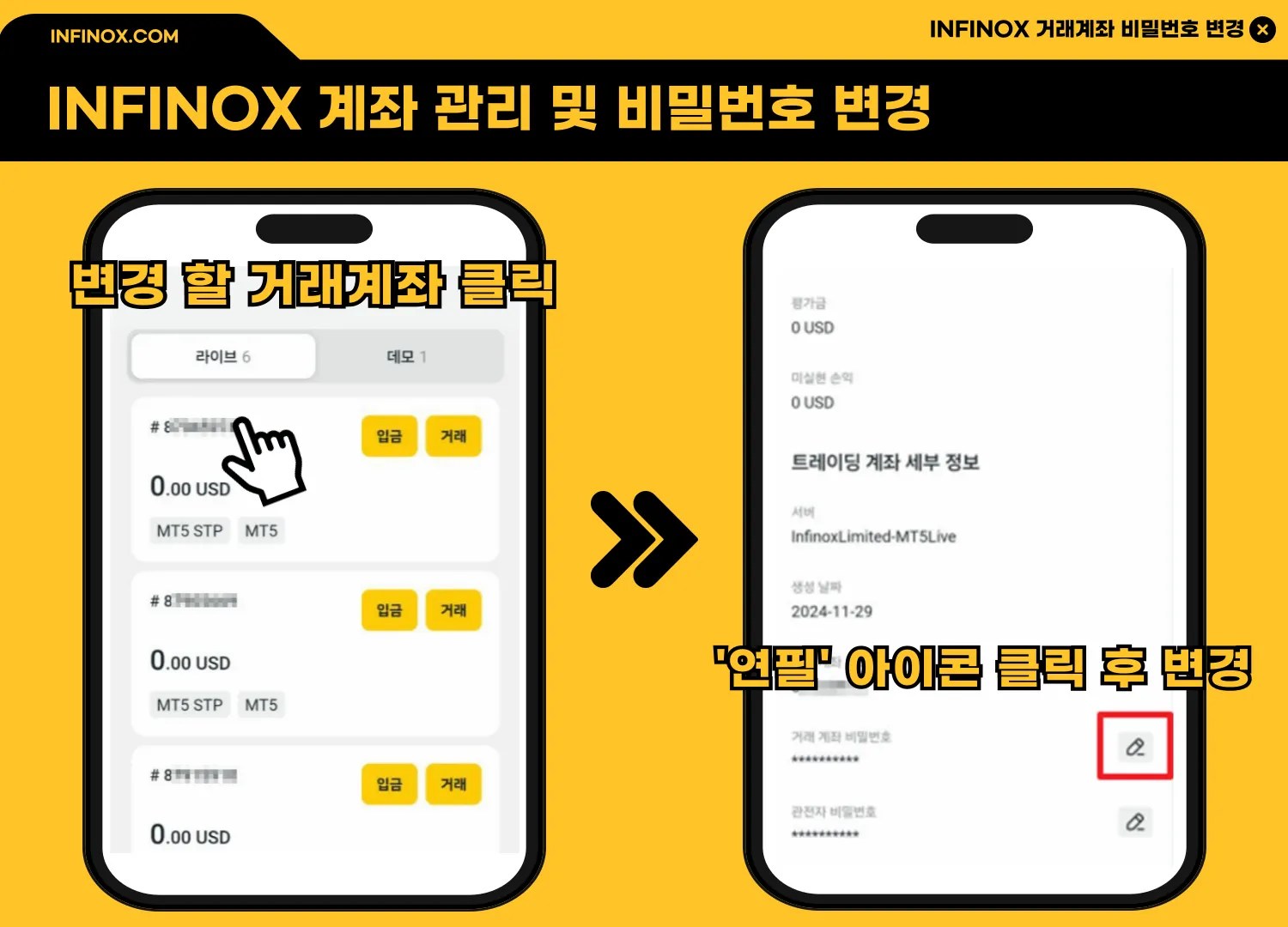\color{#FFD321}\rule{365px}{10px} 계좌 관리 및 비밀번호 변경 방법