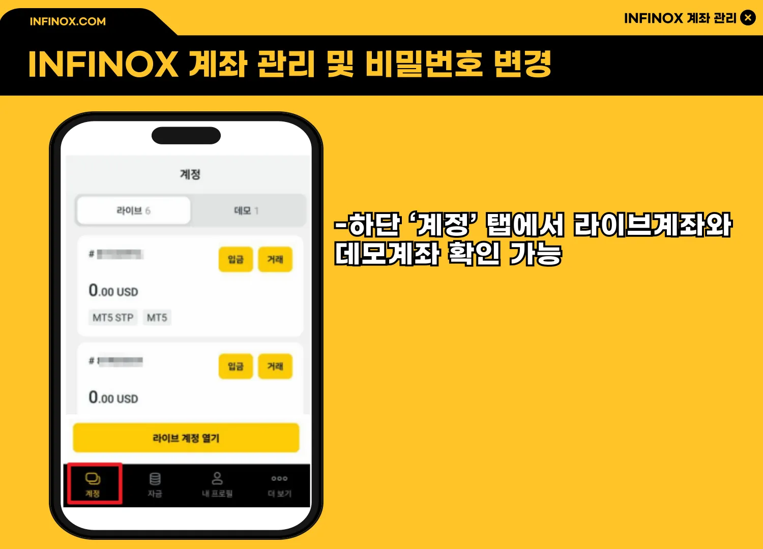 계좌 관리 : 계정 탭에서 보유중인 라이브 계좌와 데모 거래 계좌 확인이 가능합니다.