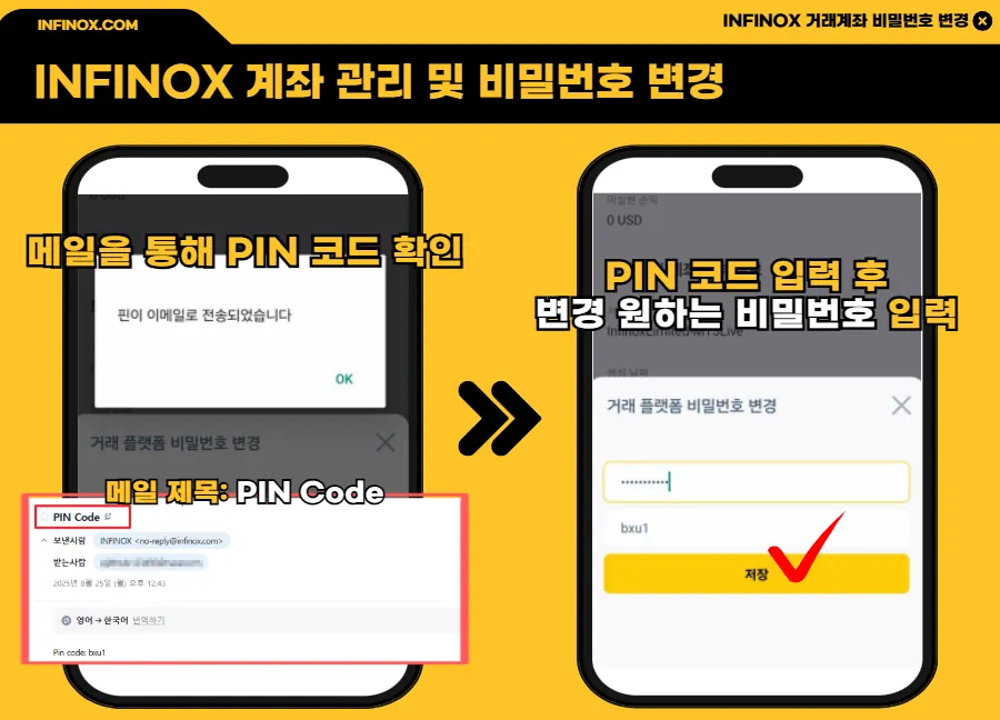 거래 계좌 비밀번호 변경 : 이메일로 수신한 PIN 코드를 입력하신 후, 새로 설정하실 비밀번호를 입력해 주세요.