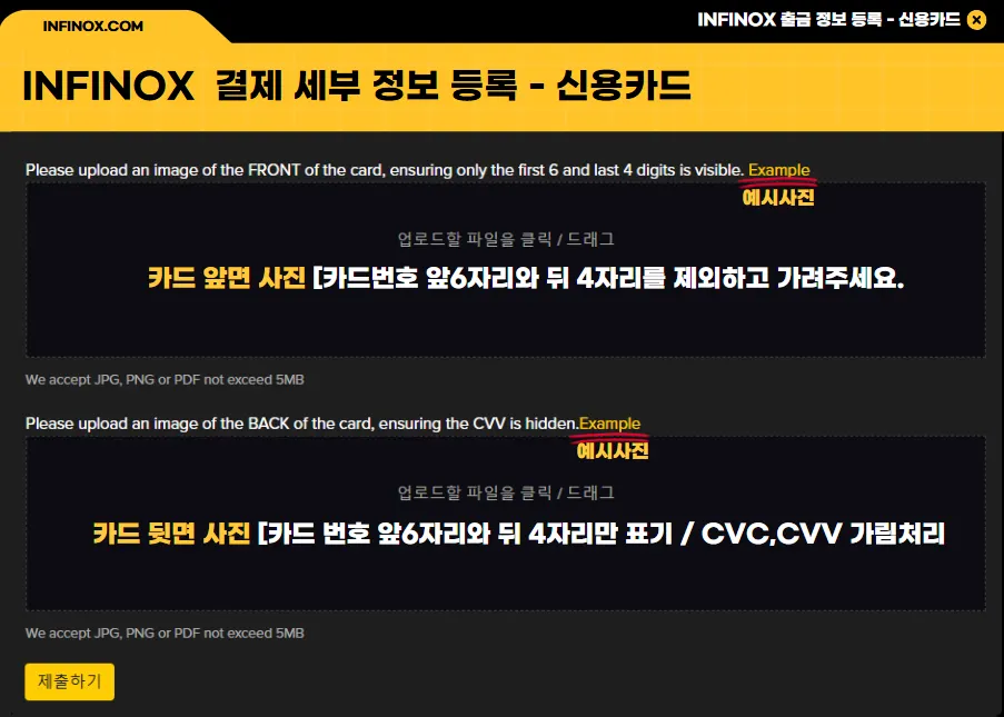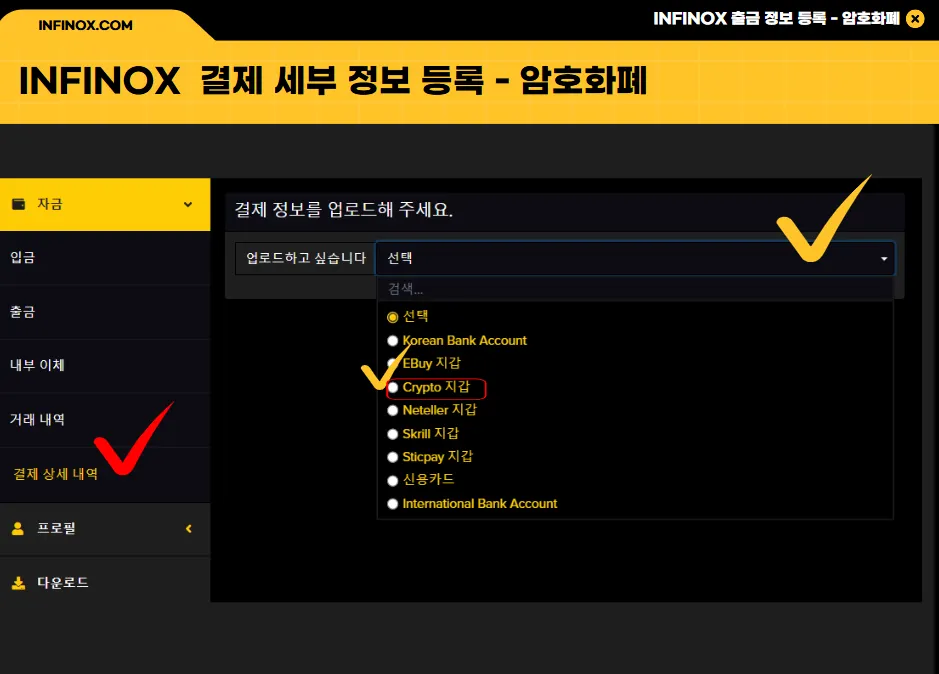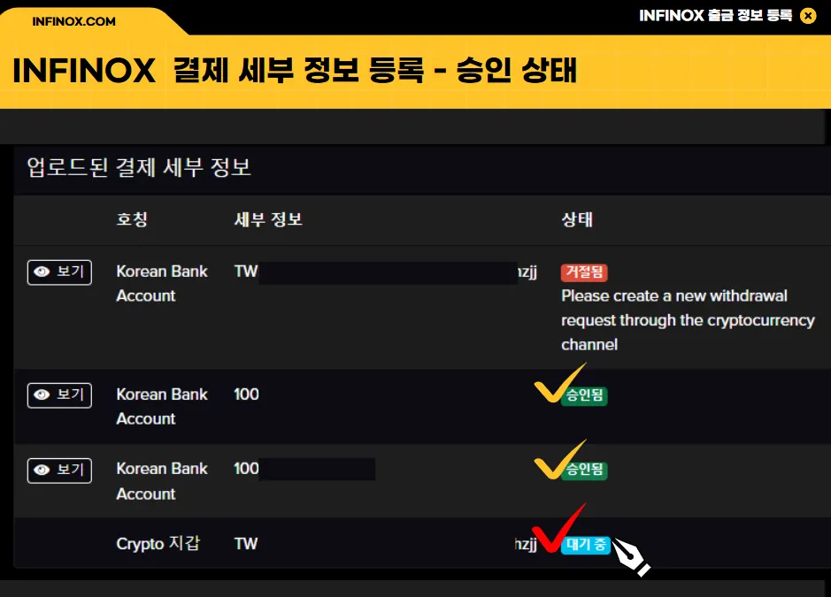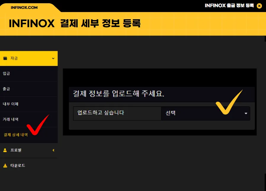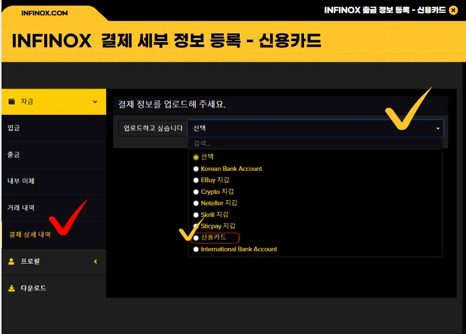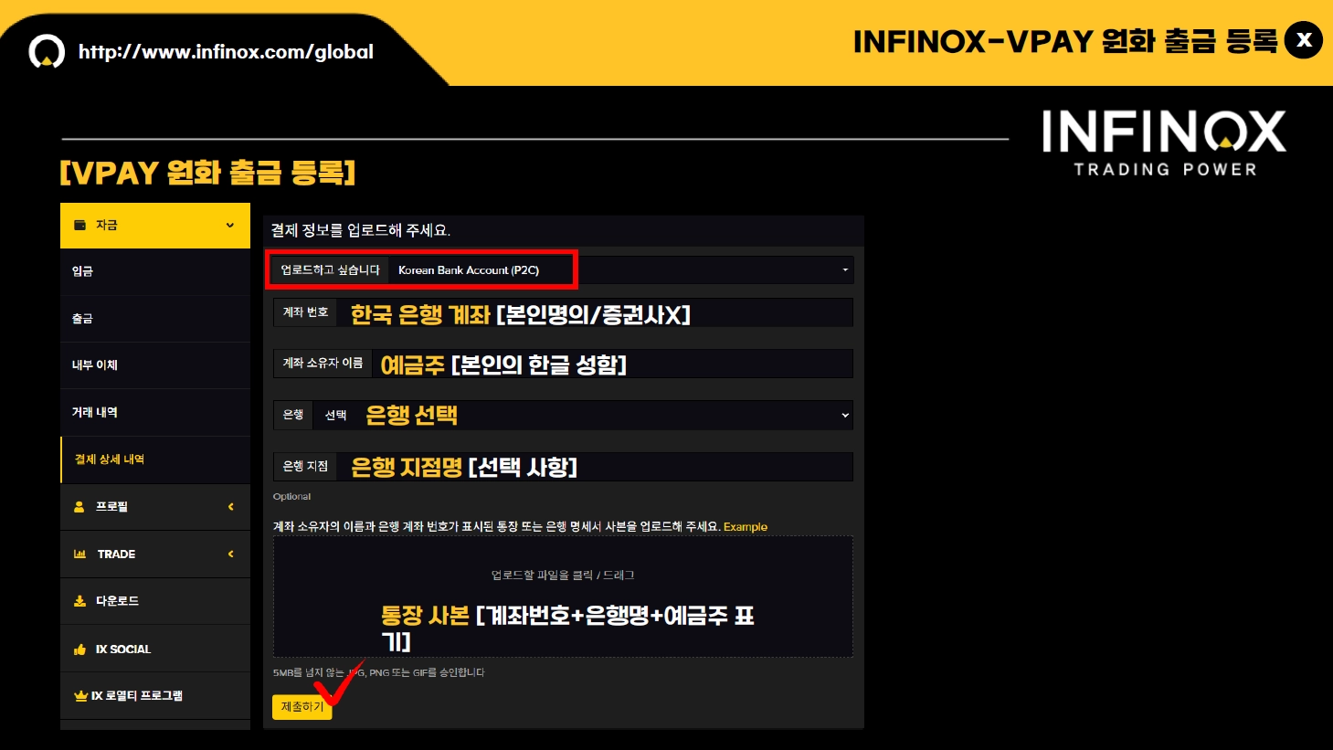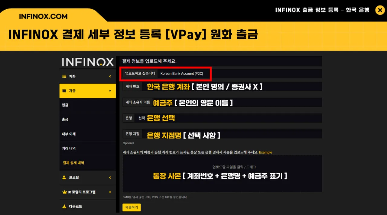 INFINOX 인피녹스 출금 신청 시 결제 상세 내역에 등록된 정보로 접수되며, 원화 출금의 경우 입금 시 사용하신 본인 명의의 은행 계좌로 출금하실 수 있습니다.