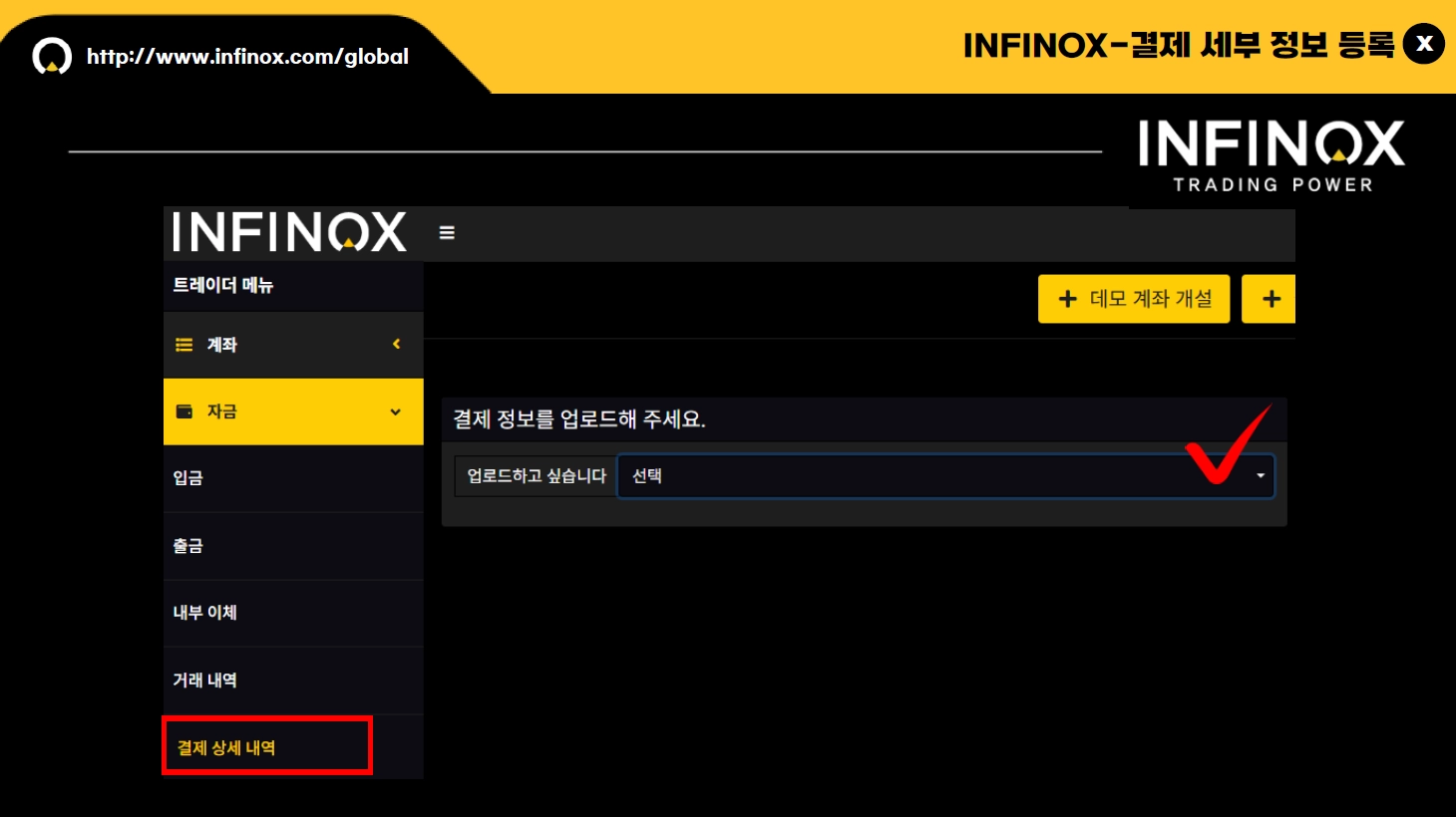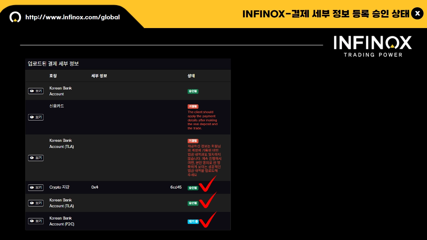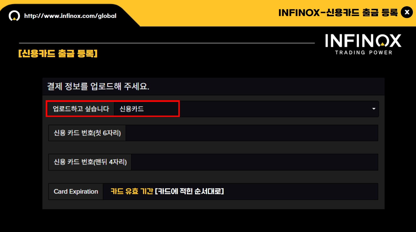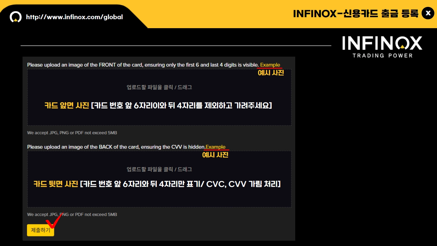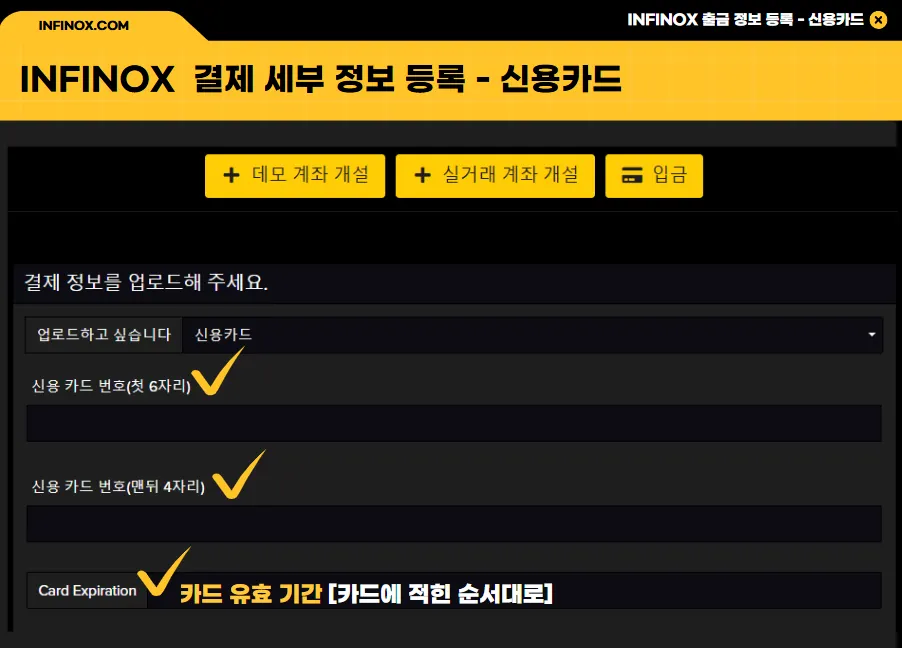 INFINOX 인피녹스 출금 신청 시 결제 상세 내역에 등록된 정보로 접수되며, 원화 출금의 경우 입금 시 사용하신 본인 명의의 은행 계좌로 출금하실 수 있습니다.
