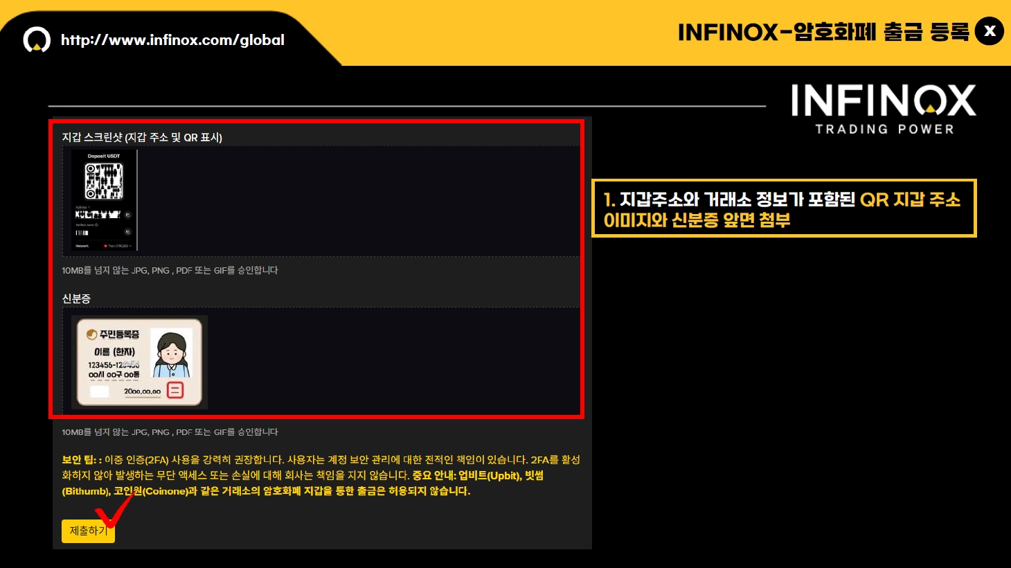 모든 정보는 본인 명의여야 하며, 일치하지 않을 경우 출금이 제한될 수 있습니다.
