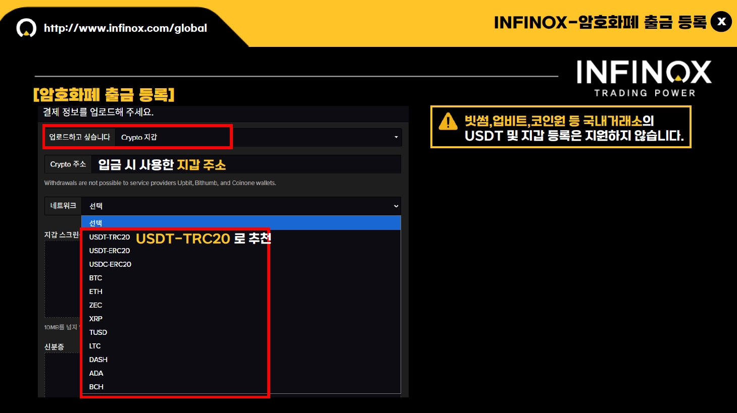 [ 빗썸, 업비트 , 코인원 등 국내거래소의 USDT및 지갑 등록은 지원하지 않습니다. ]