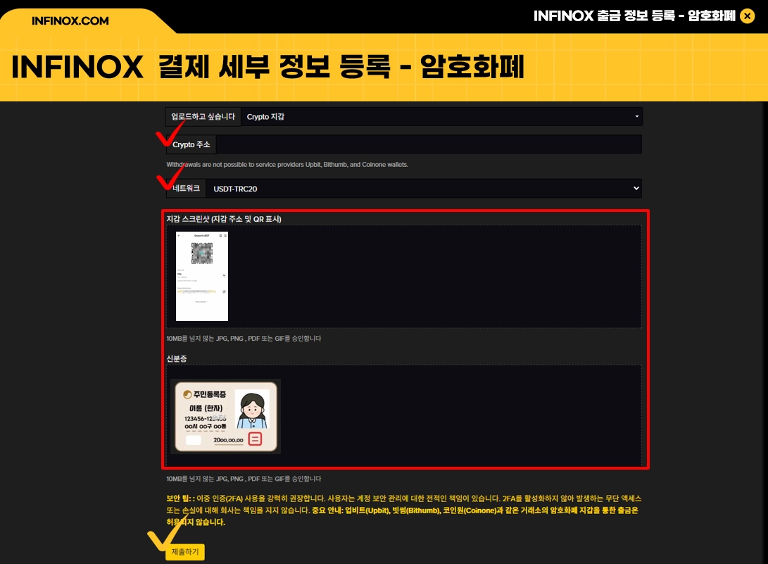 1-2. 암호화폐 출금에 필요한 결제 세부정보 등록 내용은 다음과 같습니다.