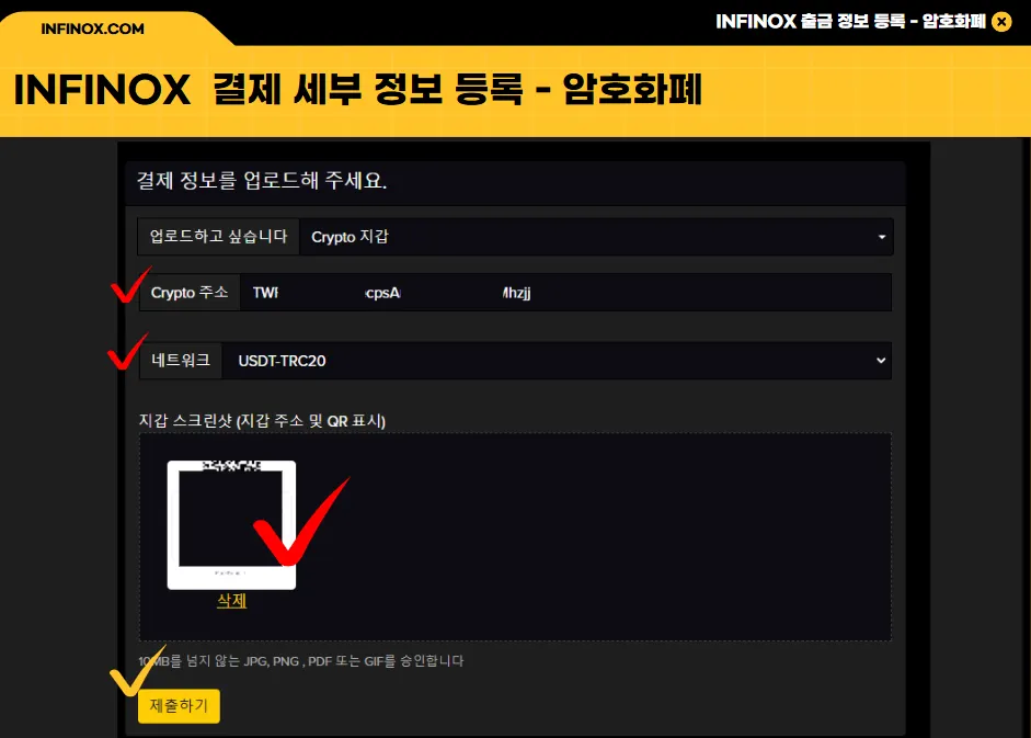 1-2. 암호화폐 출금에 필요한 결제 세부정보 등록 내용은 다음과 같습니다. - 지갑주소 - 네트워크 - 지갑주소와 거래소 정보가 포함된 QR 지갑 주소 이미지