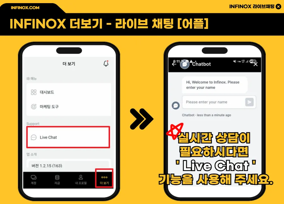 Google Play 스토어에서 “인피녹스”를 검색하여 INFINOX 공식 앱을 설치한 후, 앱에 로그인 → [더 보기] 메뉴 → [Live Chat] 선택 시 실시간 상담을 이용할 수 있습니다.