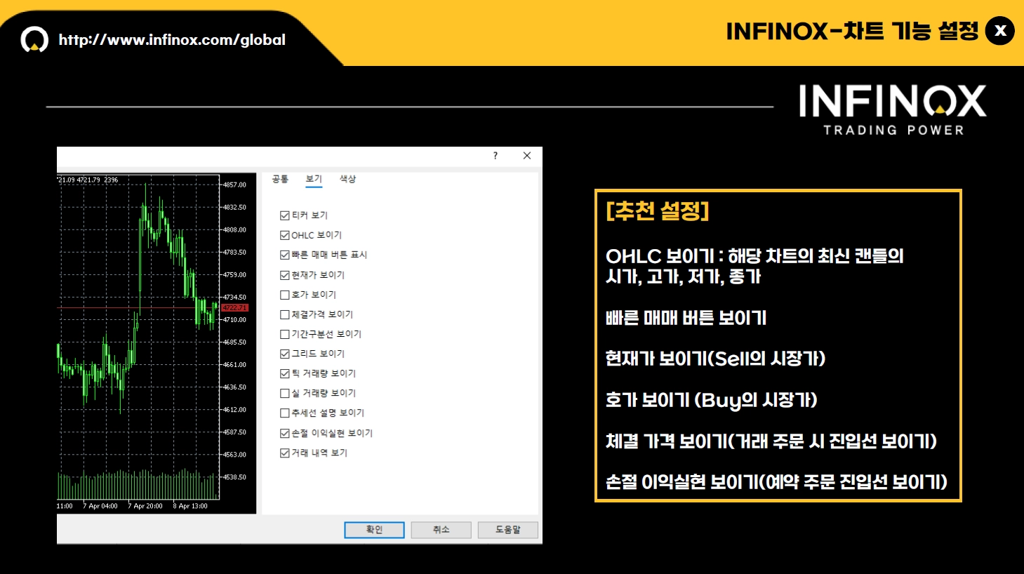 ‘보기’ 탭에 들어가신 후, 추천 설정대로 설정하신 뒤 ‘확인’ 버튼을 눌러주시면, 차트 기본 설정이 완료됩니다.