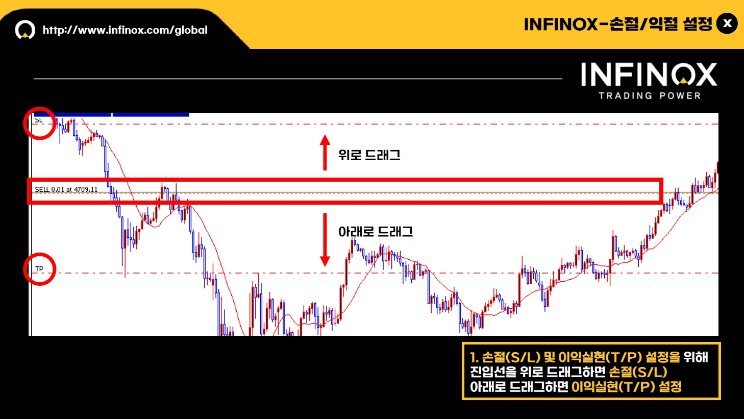 아래로 드래그하면 이익실현(T/P)이 설정됩니다. (*Sell 포지션 진입 시)