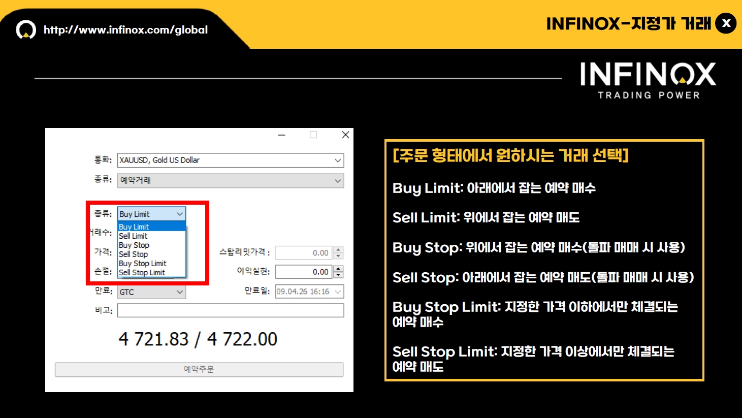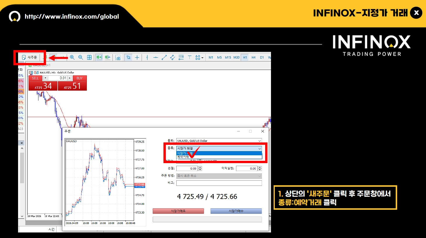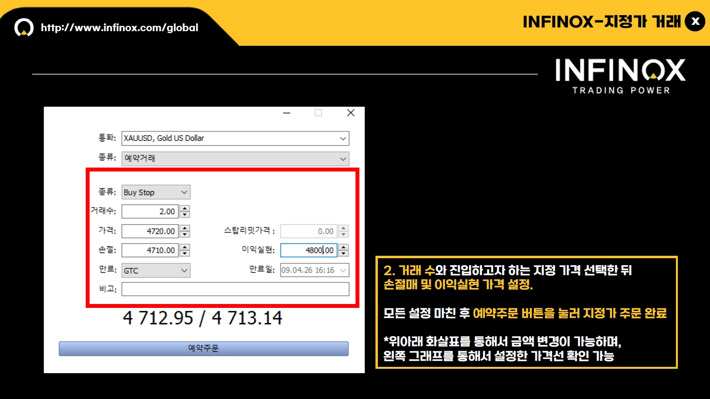 거래수, 가격, 손절(S/L) 및 이익실현(T/P) 가격을 설정 후 ‘예약주문’ 버튼을 눌러주세요.